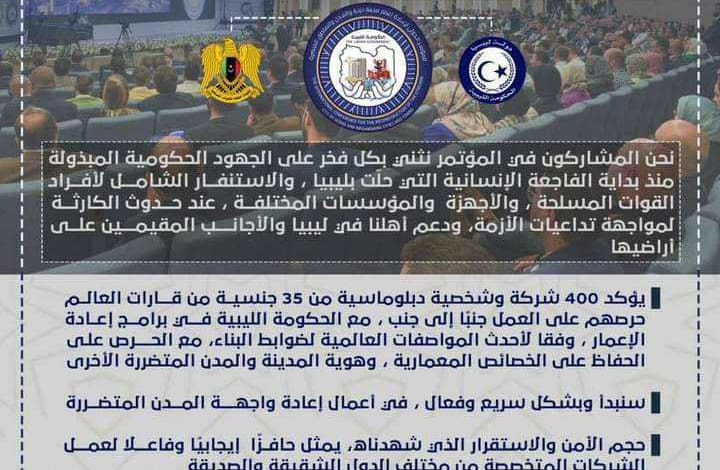 وأضاف البيان الختامي الذي نشرته الحكومة المكلفة من مجلس النواب عبر صفحتها بالفيسبوك أن المشاركين أكدوا حرصهم على العمل مع الحكومة الليبية والقيام ببرامج إعادة الإعمار، وفقا لأحدث المواصفات العالمية لضوابط البناء مع الحفاظ على الخصائص المعمارية وهوية المدنية والمدن المتضررة الأخرى، مشيرين إلى إن ( حجم الأمن والاستقرار الذي شاهدوه يشكل حافزًا إيجابيًا وفاعلاً لعمل الشركات المتخصصة من مختلف الدول ).