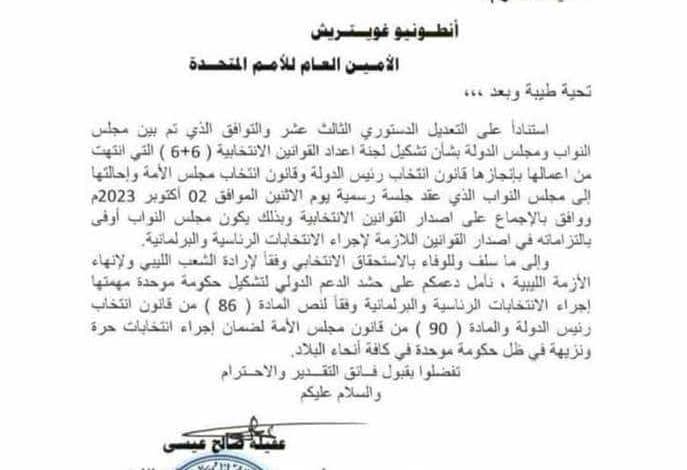 وأفاد المتحدث الرسمي باسم مجلس النواب “عبدالله بليحق” بان “عقيلة” وجه كتاباً لـ “غوتيريش” أكد خلاله على وفاء مجلس النواب بالتزاماته لإجراء الانتخابات الرئاسية والبرلمانية من خلال الموافقة بالإجماع على إصدار قانون انتخاب رئيس الدولة وقانون انتخاب مجلس الأمة المنجزة من قبل لجنة (6+6) استناداً إلى التعديل الدستوري الثالث عشر والتوافق بين مجلسي النواب و الدولة.