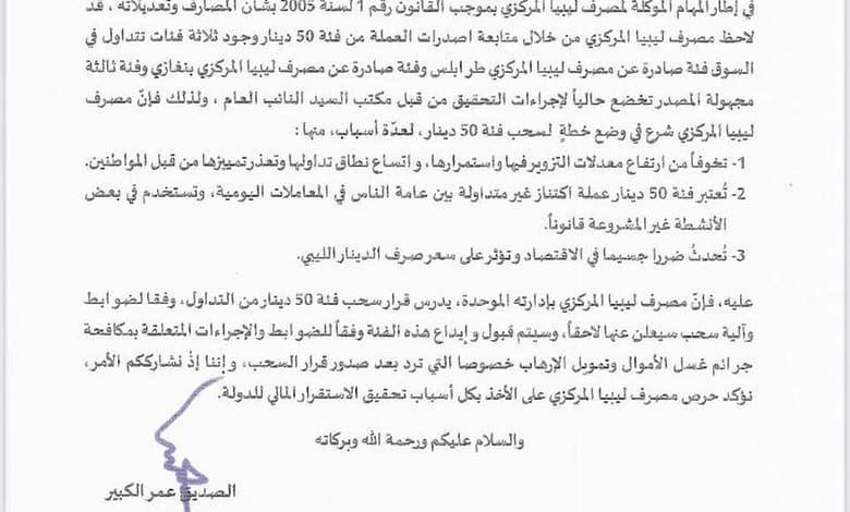 وأوضح البيان أن سحب فئة 50 دينار سيتم وفقاً للضوابط والإجراءات المتعلقة بمكافحة غسل الأموال، وسيتم قبول وإيداع هذه الفئة في المصارف التجارية وفقاً للتعليمات الصادرة من المصرف المركزي.