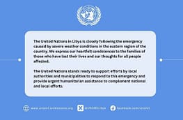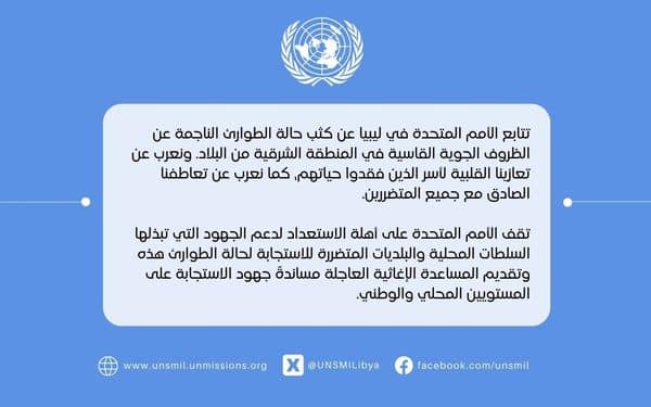 قالت بعثة الأمم المتحدة للدعم في ليبيا أنها تتابع عن كثب حالة الطوارئ الناجمة عن الظروف الجوية القاسية في المنطقة الشرقية من البلاد.