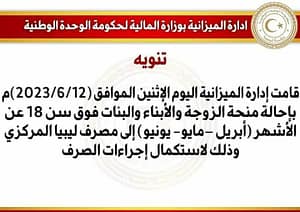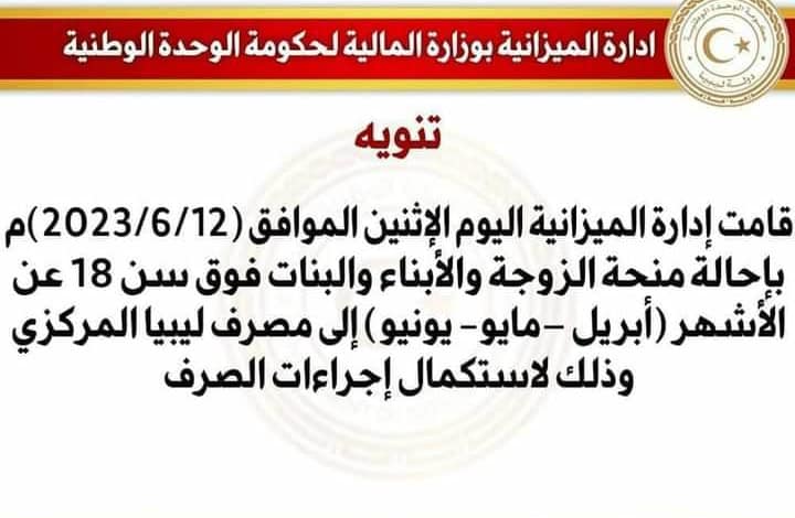 أعلنت إدارة الميزانية بوزارة المالية في حكومة الوحدة الوطنية إحالة منحة الزوجة والأبناء والبنات فوق سن 18 عن أشهر ” ابريل – مايو-يونيو ” إلى مصرف ليبيا المركزي .