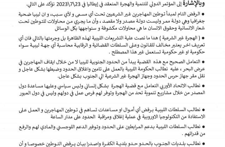 وجاء في البيان إذ نتابع ملف الهجرة غير الشرعية وتداعياتها الإنسانية وتأثيراتها الجيوسياسية على الأمن القومي الليبي والضغوطات الدولية المستمرة على الدولة الليبية من أجل التوقيع على اتفاقية 1951 م والبروتوكول الإضافي في 1967 الخاص باللاجئين بوصول الأمر إلى المطالبة بتغيير قانون الهجرة الليبي كما صرح بذلك مبعوث الأمم المتحدة السابق “مارتن كوبلر” وإلى ما جاء في المؤتمر الدولي للتنمية والهجرة المنعقد في ايطاليا مؤخرا.