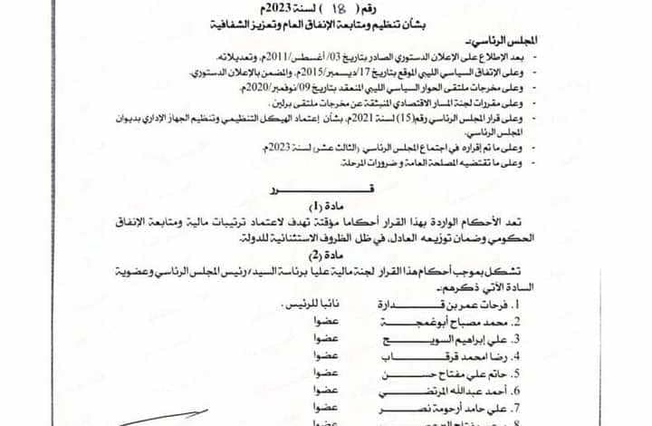 يشار إلى أن المجلس الرئاسي كان قد أصدر مؤخرا قرارا يقضي بتشكيل ( لجنة مالية عليا ) برئاسة “محمد المنفي” و”فرحات بن قدارة” نائبا له ، وعضوية ( 16 ) آخرين بينهم وزراء ومسؤولون.