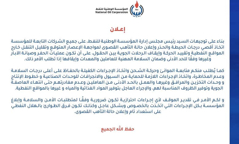 دعت المؤسسة الوطنية للنفط كل الشركات التابعة لها إلى اتخاذ أقصي درجات الحيطة والحذر ، وإعلان حالة التأهب القصوى، لـمواجهة العاصفة المتوقعة، مطالبة بتقليل التنقل خارج المواقع النفطية وتقييد الحركة وإيقاف الرحلات الجوية بين الحقول .