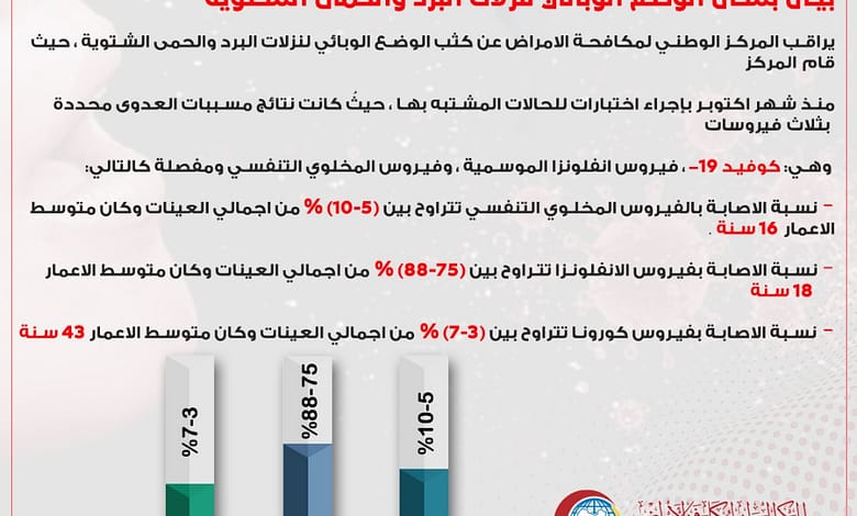 وأضاف المركز في بيان له بشأن الوضع الوبائي لنزلات البرد والحمى الشتوية بأن نسبة الإصابة بالفيروس المخلوي التنفسي تتراوح بين 5 – 10% من إجمالي العينات بمتوسط الأعمار 16 عاما، ونسبة الإصابة بفيروس الإنفلونزا تتراوح بين 75-88% من إجمالي العينات بمتوسط أعمار 18 عاما.