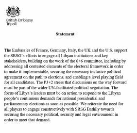 ولفت بيان الدول الخمس إلى أن المناقشات حول خارطة الطريق يجب أن تكون جزءًا من المفاوضات السياسية الأوسع التي تيسرها الأمم المتحدة ، داعيا إلى ضرورة أن ينصب تركيز قادة ليبيا على العمل للاستجابة لمطالب الليبيين المستمرة بإجراء انتخابات رئاسية وبرلمانية في أقرب وقت ممكن.