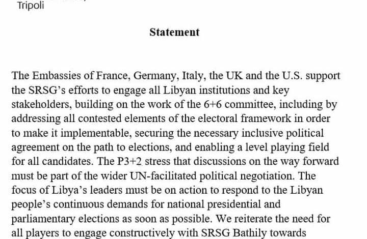 أكدت سفارات فرنسا وألمانيا وإيطاليا والمملكة المتحدة والولايات المتحدة دعمها للجهود الممثل الخاص للأمين العام للأمم المتحدة لدى ليبيا ” عبدالله باتيلي” في لإشراك جميع الأطراف في معالجة النقاط المختلف عليها بقوانين لجنة ( 6+6) لجعلها قابلة للتنفيذ.