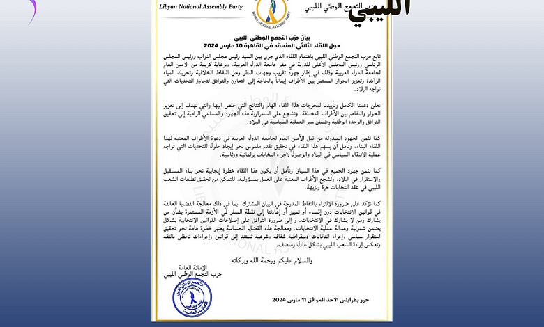حزب التجمع الوطني الليبي يدعم مخرجات اللقاء الثلاثي في القاهرة
