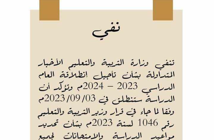 وأكدت الوزارة أن الدراسة ستنطلق في 3 -9 -2023م وفقا لما جاء في قرار وزير التربية والتعليم رقم 1046 لسنة 2023 بشأن تحديد مواعيد الدراسة والامتحانات لجميع المراحل التعليمية.