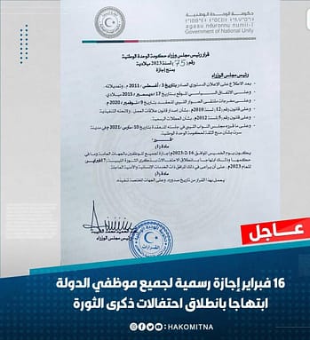 أصدر رئيس حكومة الوحدة الوطنية عبدالحميد الدبيبة، القرار رقم (75) لسنة 2023، بمنح يوم الخميس الموافق (16) فبراير إجازة رسمية احتفالا بذكرى ثورة السابع عشر من فبراير..