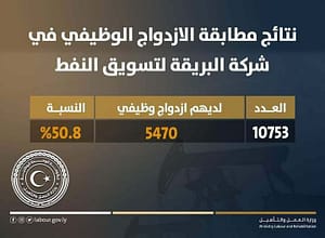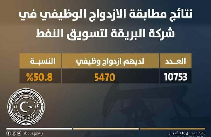 وقالت الوزارة في منشور لها عبر صفحتها الرسمية بموقع ” فيسبوك ” إن نتائج مطابقة الازدواج الوظيفي في شركة البريقة لتسويق النفط كانت ( 5470 ) ازدواج وظيفي من عدد ( 10753 ) أي بمعدل 50% .