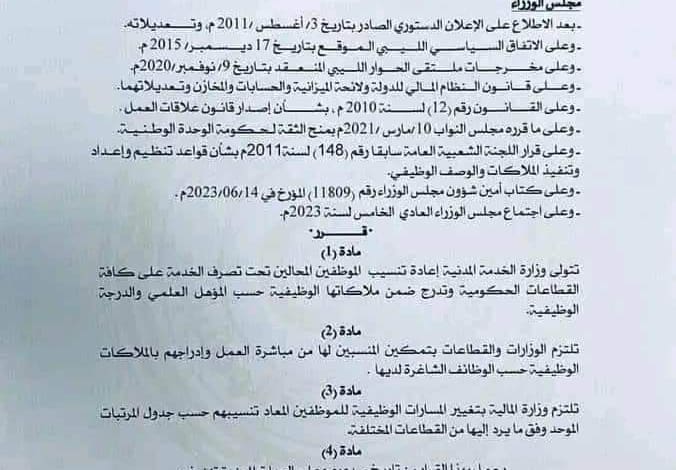 فيما نصت المادة الثالثة من القرار على أن تلتزم وزارة المالية بتغيير المسارات الوظيفية للموظفين المعاد تنسيبهم حسب جدول المرتبات الموحد وفق ما يرد إليها من القطاعات المختلفة.