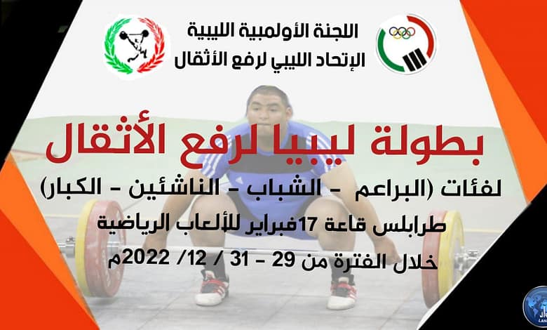 تنطلق غذاً الخميس بقاعه 17فبراير بطرابلس بطولة ليبيا للرفع الأثقال لفئات البراعم والشباب والناشئين والكبار بمشاركة (153) رياضي يمثلون (15) ناديا .