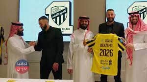 ونشر الاتحاد فيديو يظهر فيه “بنزيمة” يقول باللغة عربية “انا متحمس لشوفكم (أراكم) في جدة”، وقيامه بتوقيع عقد انضمامه للاتحاد إلى جانب رئيس النادي “أنمار الحائلي” قبل أن يتصافحا بعد التوقيع ويرفع “بنزيمة” قميص الاتحاد.
