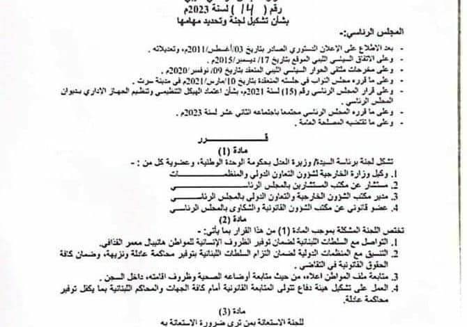 وكلف المجلس في قراره رقم (14) لسنة 2023م اللجنة بالتنسيق مع المنظمات الدولية لضمان التزام السلطات اللبنانية بتوفير محاكمة عادلة ونزيهة لـ “هانيبال القذافي”، وضمان كافة حقوقه القانونية في التقاضي ، وكذلك متابعة أوضاعه الصحية وظروف إقامته داخل السجن .