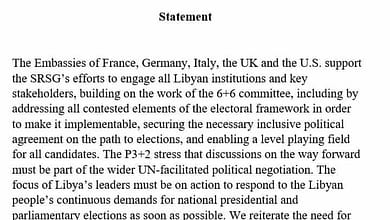 أكدت سفارات فرنسا وألمانيا وإيطاليا والمملكة المتحدة والولايات المتحدة دعمها للجهود الممثل الخاص للأمين العام للأمم المتحدة لدى ليبيا ”…